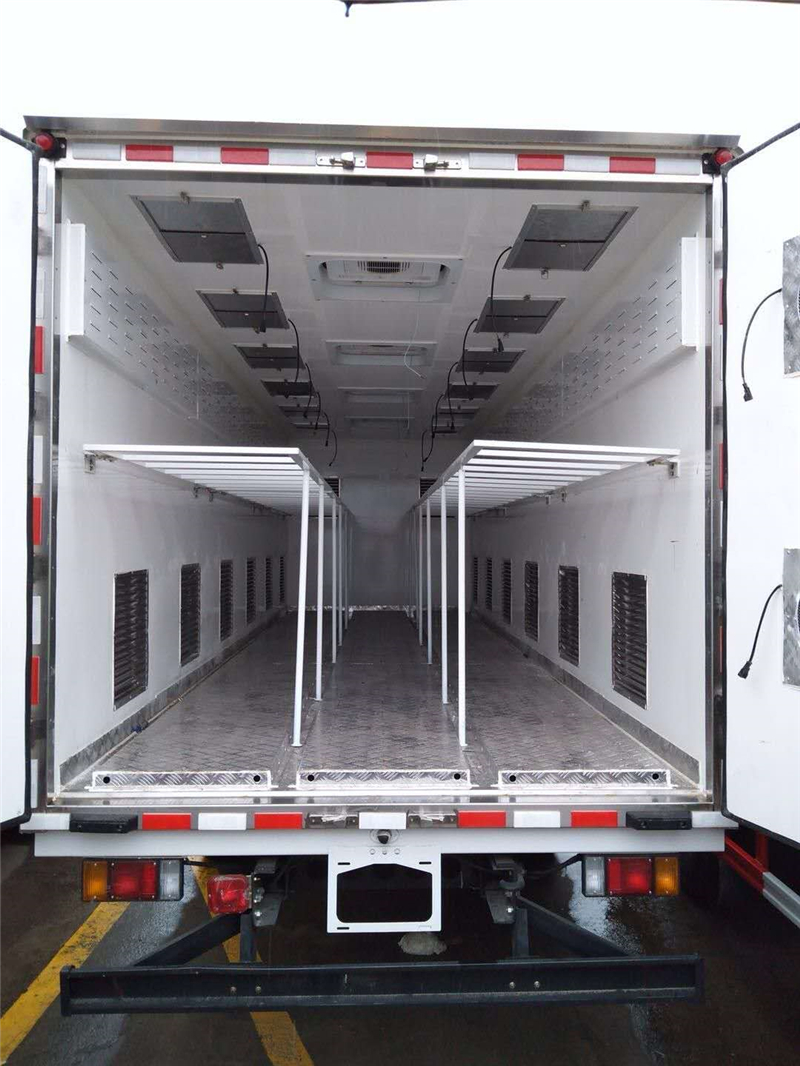 【豬苗車】上裝配置:外玻璃鋼,內(nèi)不銹鋼,兩層液壓升降層板,尾部液壓翻轉(zhuǎn)上豬平臺(tái),層板為不銹鋼骨架鋪鋁花紋板。外部電動(dòng)升降窗,排氣扇,柴油發(fā)電機(jī),暖風(fēng)加熱,喂水系統(tǒng),凈水箱、污水