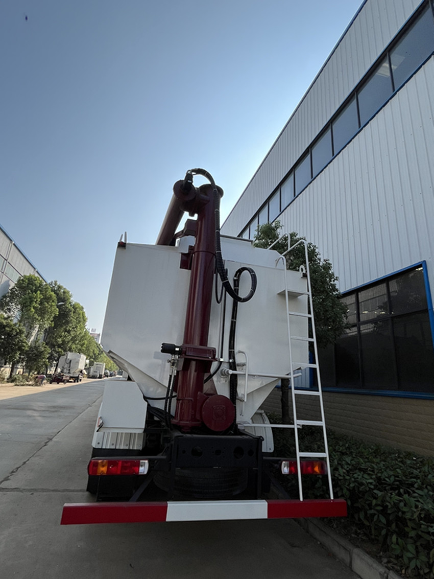 散裝飼料運(yùn)輸車,散裝飼料車的飼料罐架設(shè)在卡車的底盤上,罐頂開有進(jìn)料口.頂部的一根螺旋輸送卸料管(俗稱卸料絞龍)則可自由回轉(zhuǎn)和抬升,抬升的仰角可達(dá)60度。運(yùn)輸時(shí),頂部的螺旋管平臥在罐頂;卸料時(shí)則抬起,使管端的出料口與畜禽飼養(yǎng)場貯料罐頂部的進(jìn)料門相接,駕駛室內(nèi)裝有操縱裝置(操縱裝置也可裝置在罐體尾部),卸料時(shí)通過車底的動(dòng)力輸出軸和減速器來驅(qū)動(dòng)螺旋,以完成卸料。