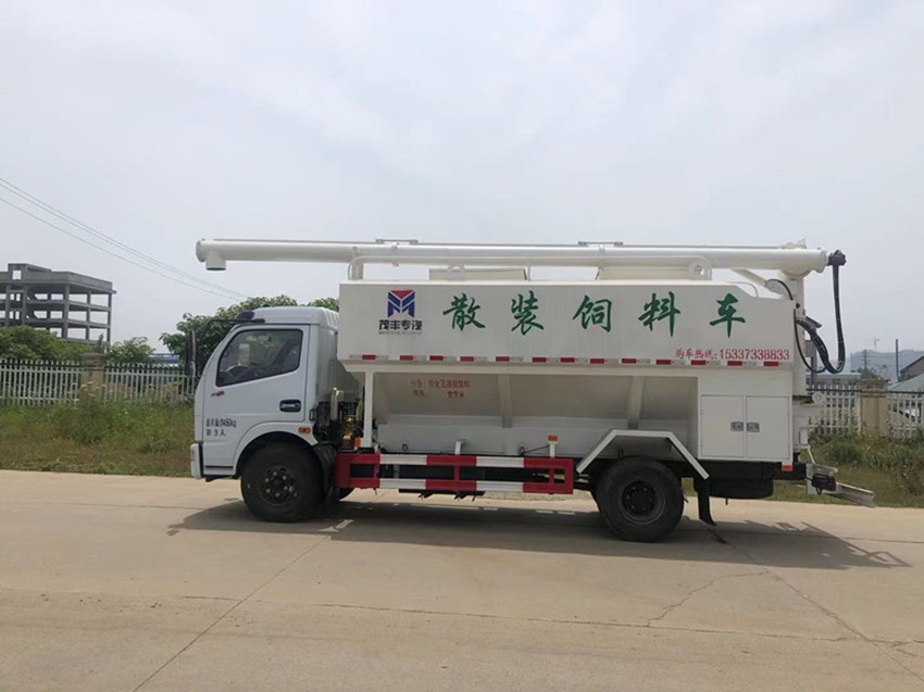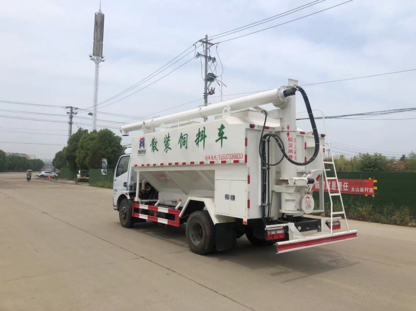 散裝飼料運(yùn)輸車(chē),散裝飼料車(chē)的飼料罐架設(shè)在卡車(chē)的底盤(pán)上,罐頂開(kāi)有進(jìn)料口.頂部的一根螺旋輸送卸料管(俗稱(chēng)卸料絞龍)則可自由回轉(zhuǎn)和抬升,抬升的仰角可達(dá)60度。運(yùn)輸時(shí),頂部的螺旋管平臥在罐頂;卸料時(shí)則抬起,使管端的出料口與畜禽飼養(yǎng)場(chǎng)貯料罐頂部的進(jìn)料門(mén)相接,駕駛室內(nèi)裝有操縱裝置(操縱裝置也可裝置在罐體尾部),卸料時(shí)通過(guò)車(chē)底的動(dòng)力輸出軸和減速器來(lái)驅(qū)動(dòng)螺旋,以完成卸料。